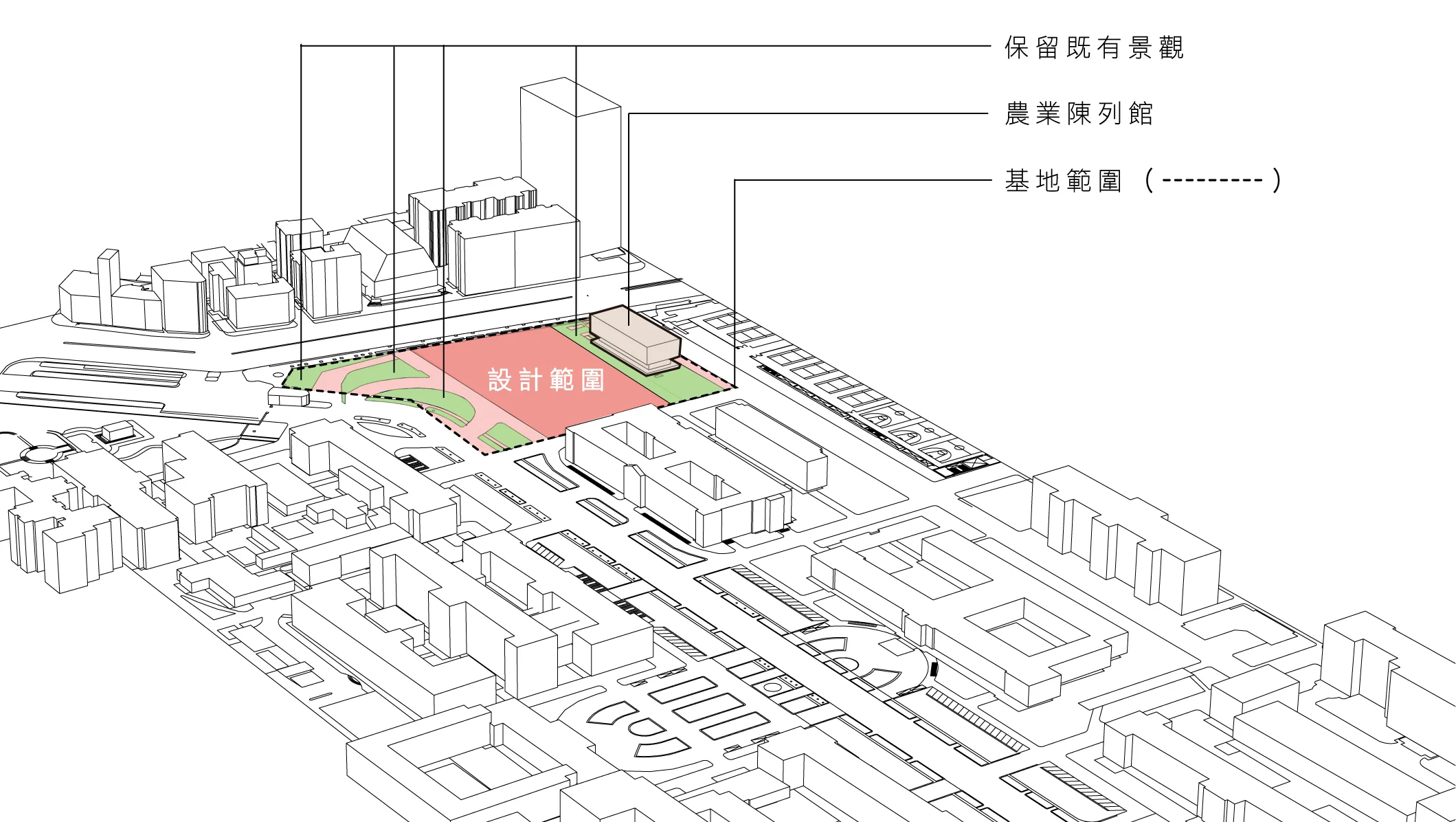 人文館的基座向上抬升 50 公分,與農業陳列館相同,以試圖延續農業陳列館的基座表現。