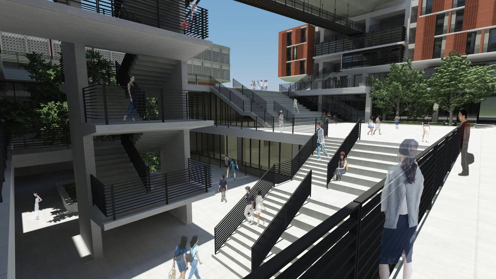 人文館北側接鄰農業陳列館,在 9.5 公尺的棟距之外,並採取底部挑空 4 層樓的大跨距空間設計,利用通透的視野連繫今昔兩棟建築。不以實體的共構,使用公共空間的連結,將農業陳列館納入了中庭的合院關係。